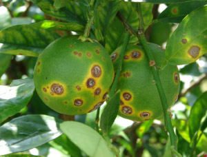 Los síntomas de cancrosis de los cítricos incluyen frutas con manchas levantadas de color café.