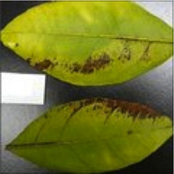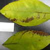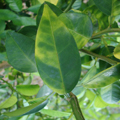 Los síntomas de Huanglongbing (enverdecimiento de los cítricos) incluyen hojas manchadas o con una textura de cuero y con venas amarillas o claras.